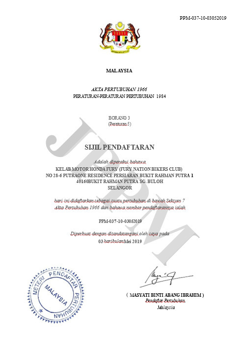Kelab Motor Honda Fury (Fury Nation Bikers Club) is officially registered under the Societies Act 1966, as a testament to our commitment to operate lawfully, responsibly, and with integrity for the benefit of our members and the community.